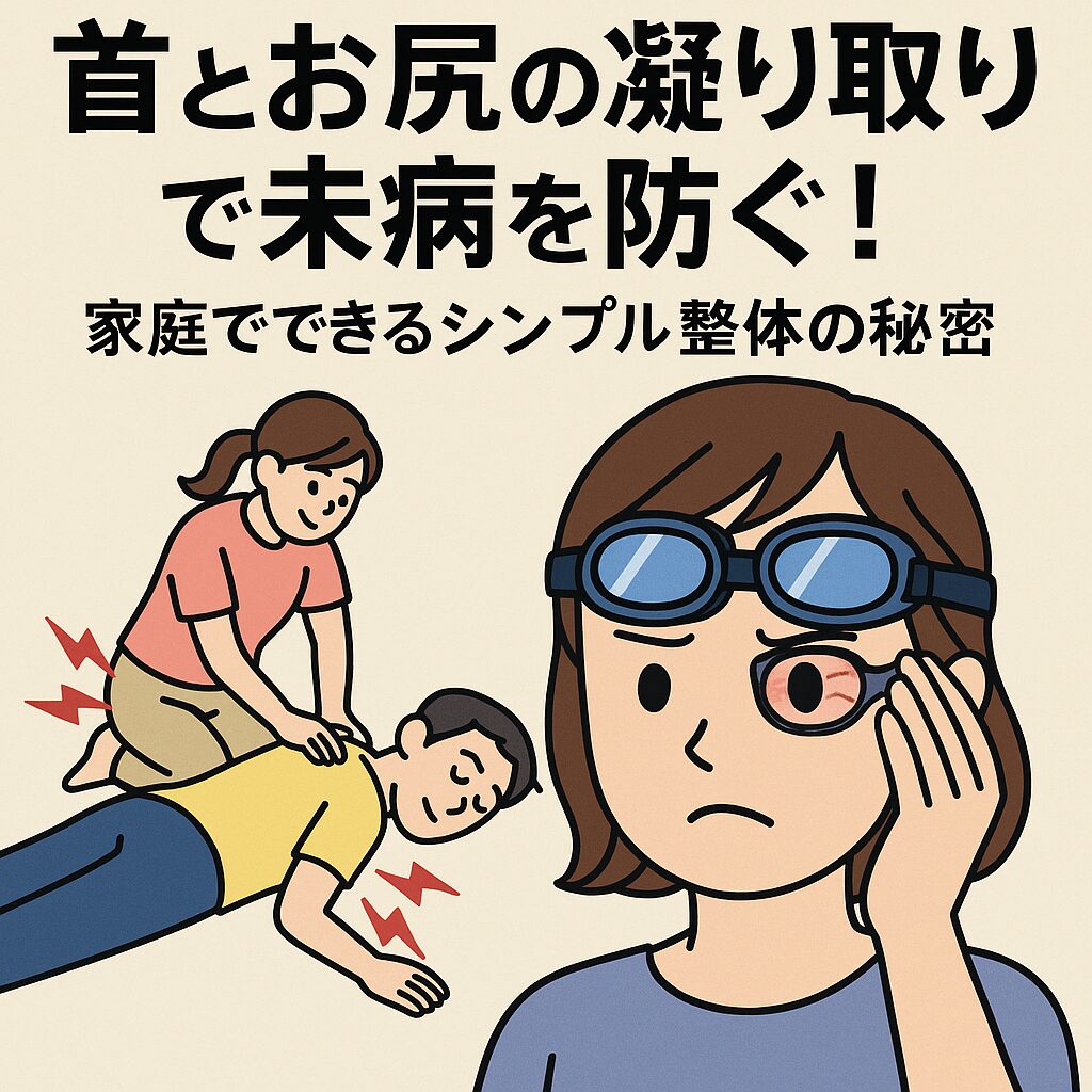 メタディスクリプション:「首とお尻の凝り取りで未病を防ぐ!家庭でできるシンプル整体とゴーグル打撲による目の充血ケース、実践手順・注意点まで解説。」