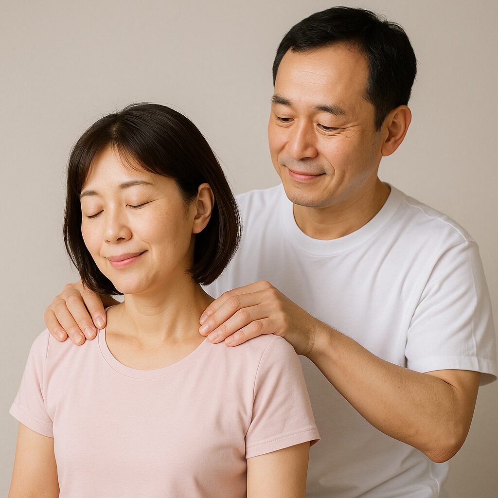 - 首:胸鎖乳突筋・僧帽筋上部・後頭下筋群を軽圧で呼吸合わせ