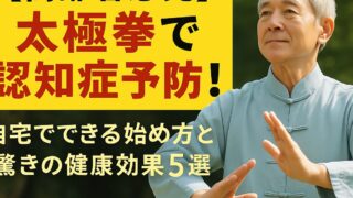 シニアと太極拳 【高齢者必見】太極拳で認知症予防!自宅でできる始め方と驚きの健康効果5選 メタディスクリプション: 高齢者におすすめの太極拳について、認知症予防効果から自宅での始め方まで詳しく解説。バランス改善・筋力強化・ストレス軽減など5つの健康効果と、地域の教室の探し方もご紹介。シニア世代の健康的な生活をサポートします。sl... 2025.09.14 シニアと太極拳